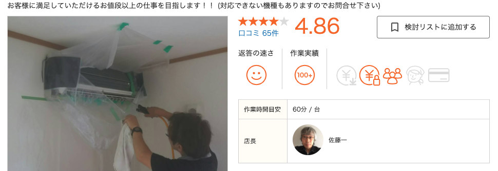 エアコン1台、税込7,500円からという破格なお値段に加えて駐車場代は業者持ちなので、コスパ最高です。また早朝深夜の対応もしてくれるので、日中仕事の人にも安心ですね。